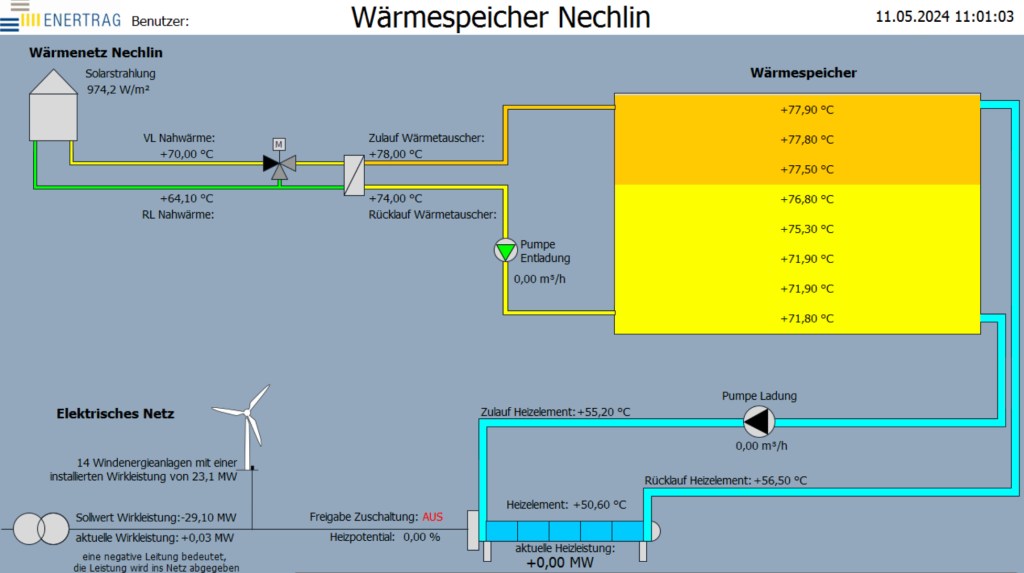 Mittels Strom aus Windkraft kann jede gewünschte Temperatur hergestellt werden. Ein Wärmenetz mit einer Vorlauftemperatur von über 60 Grad ist besonders sinnvoll für vorhandene ältere Gebäude, wo eine Wärmedämmung zu teuer oder unmöglich wäre. Der eingesetzte Strom aus Windkraft ist extrem kostengünstig, da der Speicher nur bei viel Wind und entsprechend niedrigem Strompreis gefüllt wird. Die Wärme wird dabei aus Windenergie gewonnen und zwar nach dem Prinzip „Nutzen statt Abregeln“. Mit Energiespitzen, die für eine andere Nutzung zu selten sind, werden 1 Million Liter Wasser in dem gut gedämmten Speicher auf bis zu 93 Grad erwärmt. Aus dem Speicher heraus erfolgt dann die Wärmeversorgung.